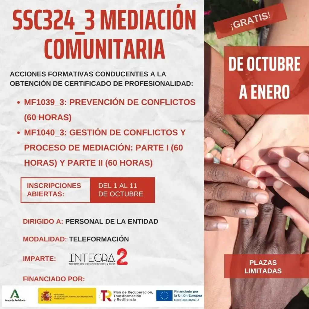 FORMACIÓN PARA TRABAJADORES DE LA ENTIDAD, en modalidad online. Este proyecto ha permitido impartir módulos formativos conducentes al certificado de profesionalidad Mediación Comunitaria SSC324.