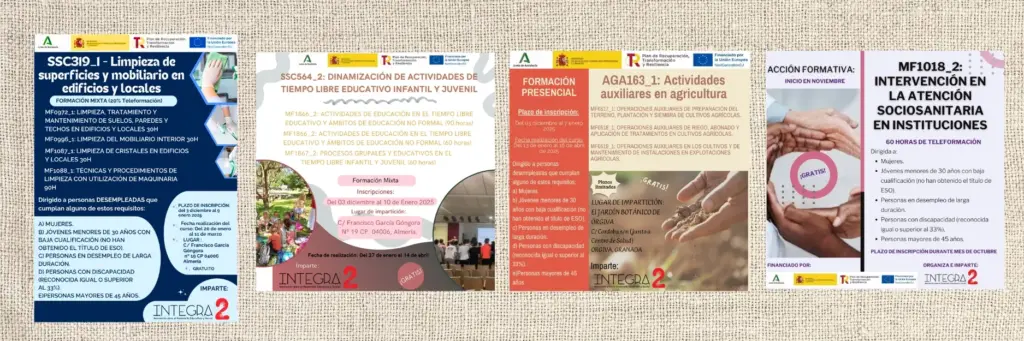 El Programa ha estado formado por 18 formaciones, enmarcadas en los sectores AGA 163_1 Actividades Auxiliares en Agricultura, SSC564_2 Dinamización de actividades de tiempo libre educativo infantil y juvenil, SSC319_1 Limpieza de superficies y mobiliario en edificios y locales y MF1018_2 Atención sociosanitaria en instituciones sociales.
