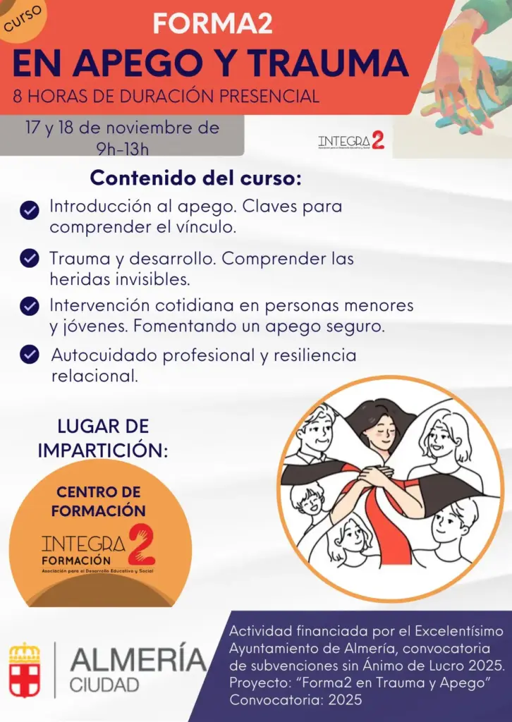Financiado por el Ayuntamiento de Almería, se ha dirigido a profesionales de intervención psicosocial que que desarrollan su labor profesional con menores y jóvenes, de cara a la adquisición de conocimientos y habilidades relacionados con el establecimiento de vínculos saludables, apego seguro y abordaje del trauma para poder desarrollar su labor de forma más eficaz.